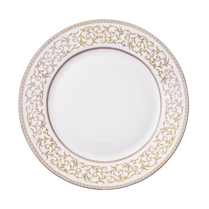 Luxusní mělký talíř GOLDEN z kvalitního porcelánu s jemným zlatým dekorem je ideální pro servírování hlavních chodů, předkrmů nebo pokrmů s omáčkou při slavnostních příležitostech. Elegantní design a odolný materiál dodávají stolování sofistikovaný a luxusní vzhled.