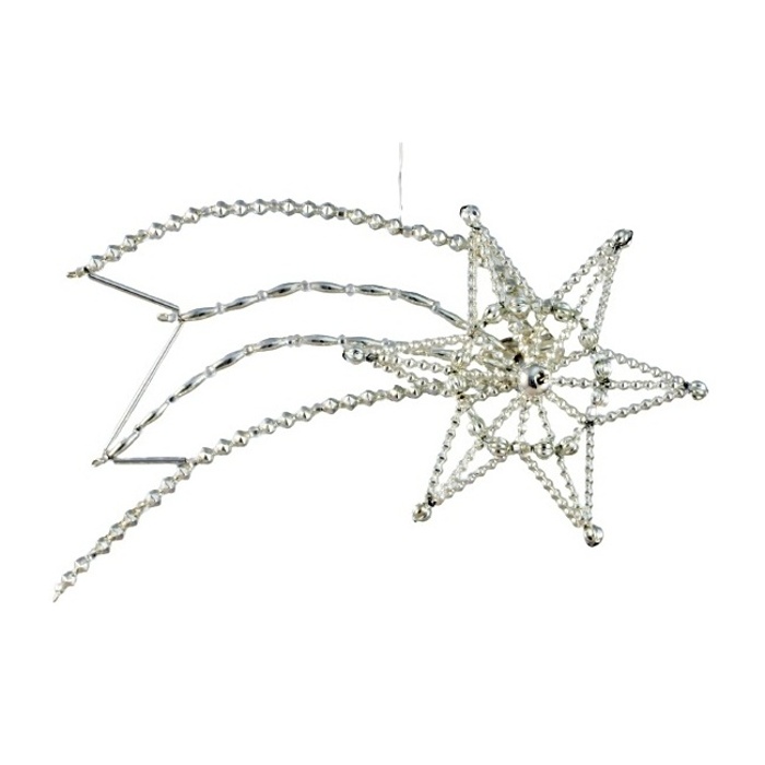 Impozantní stříbrná vánoční ozdoba ve tvaru komety o délce 20 cm je zdobená dekorativními perličkami, které vytvářejí elegantní třpytivý efekt. Skvělý doplněk pro větší stromečky, sváteční aranžmá nebo výrazné dekorace, které upoutají pozornost.