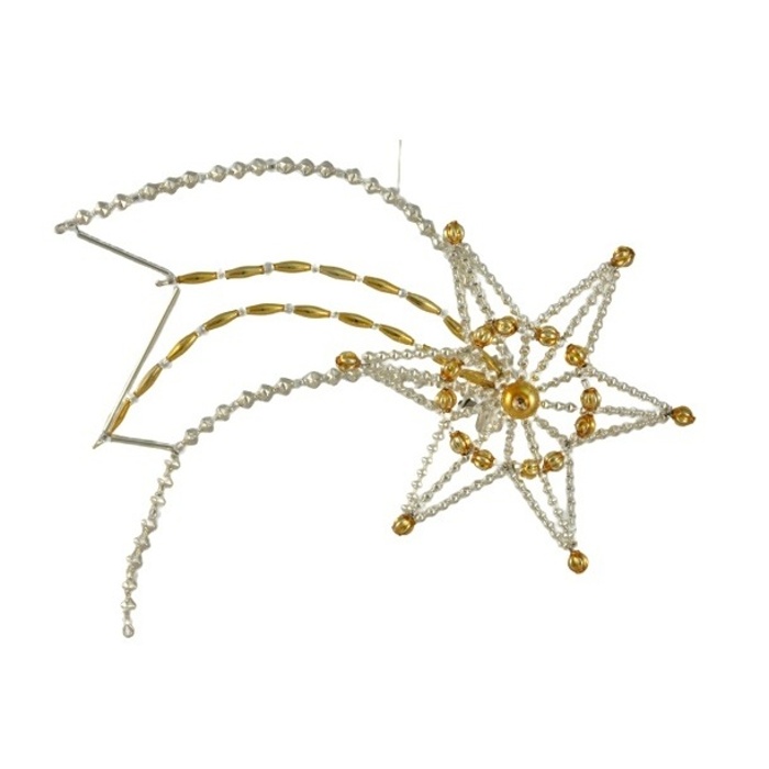 Luxusní zlatá vánoční ozdoba ve tvaru komety o délce 20 cm je zdobená jemnými perličkami, které vytvářejí elegantní třpytivý efekt. Tento doplněk je ideální pro velké stromečky i slavnostní aranžmá, která potřebují zářivý akcent.