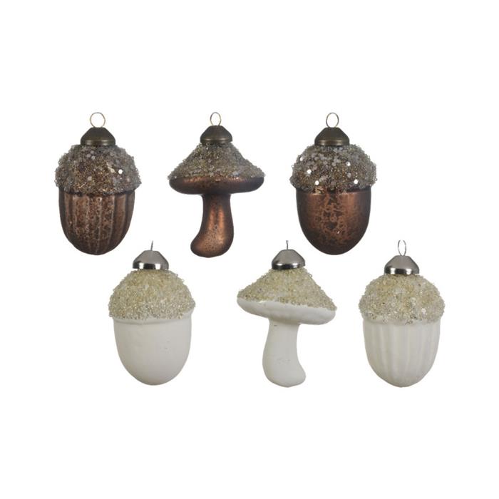 Originální skleněné ozdoby ve tvaru houby a žaludu přinesou na váš vánoční stromeček nádech lesa, přírody a pohádkové atmosféry. Ozdoby jsou bohatě zdobené jemnými glitry, které jim dodávají slavnostní třpyt a vytvářejí krásné odlesky při dopadu světla. Ozdoba v mixu provedení. Pokud si přejete konkrétní variantu, napište ji do poznámky, pokusíme se vyhovět. V případě nedostupnosti bude odeslán náhodný kus.