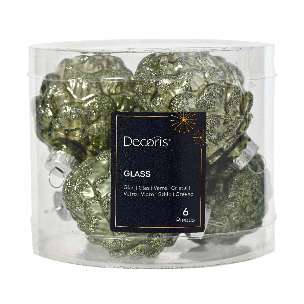 Sada skleněných vánočních ozdob pro dekoraci interiéru.