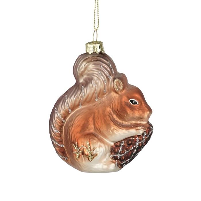 Roztomilá a detailně zpracovaná vánoční ozdoba ze skla ve tvaru veverky držící šišku přinese vašemu stromečku kouzlo lesa a zimní pohádky.