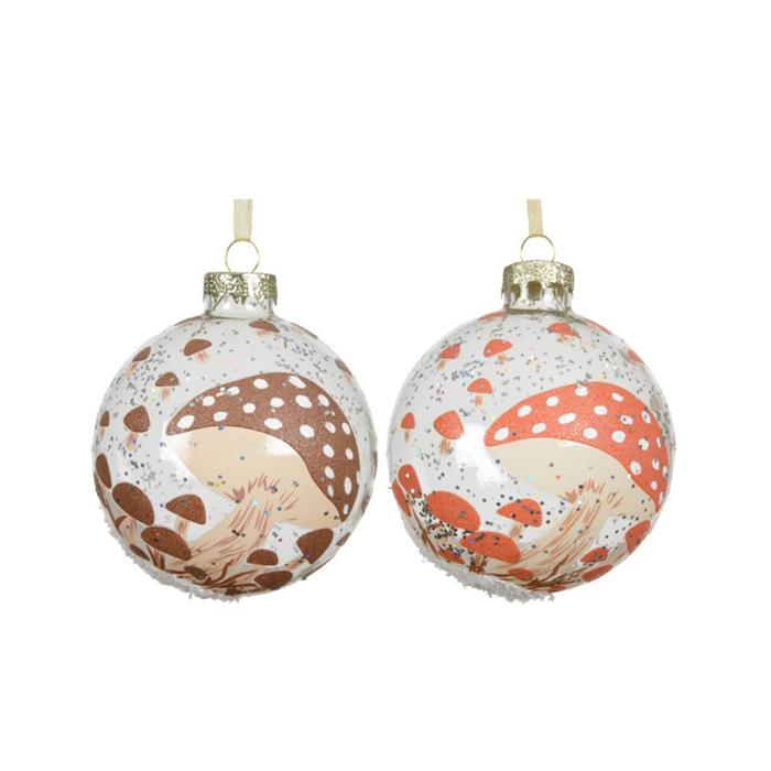 Vneste do své vánoční výzdoby lesní kouzlo a pohádkovou atmosféru s těmito originálními skleněnými koulemi. Ozdoba o průměru 8 cm je vyrobena z čirého skla s motivem houbiček. Ozdoba v mixu provedení. Pokud si přejete konkrétní variantu, napište ji do poznámky, pokusíme se vyhovět. V případě nedostupnosti bude odeslán náhodný kus.