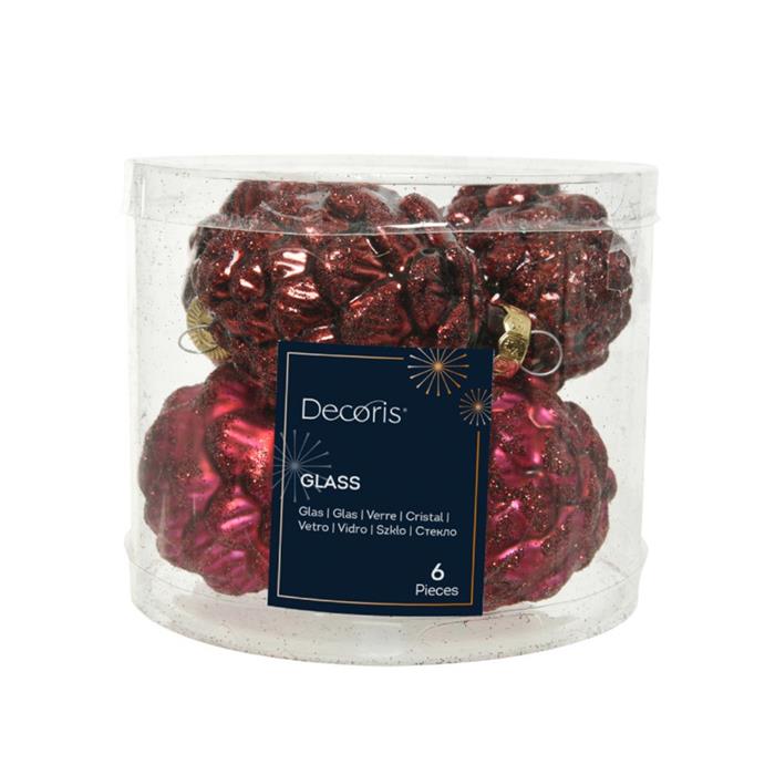 Sada skleněných ozdob šišky s glitry vínové 6ks