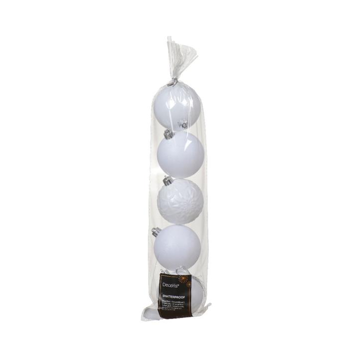 Sada pěti bílých plastových koulí v kombinaci různých povrchů – lesklé, matné a s jemným reliéfem – přináší do vaší vánoční výzdoby stylovou rozmanitost v jednotném tónu. Lehký, odolný materiál zajišťuje snadné zavěšení i dlouhou životnost. Ideální pro elegantní a sladěné ozdobení stromečku nebo svátečních aranžmá.
