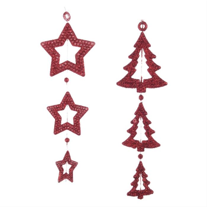 Ozdoba plastová hvězdy nebo stromy děrovaná s glitry 18cm červená
