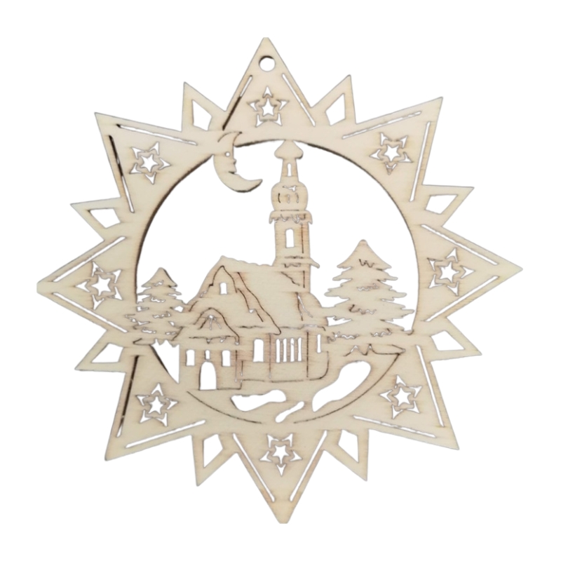 Ozdoba dřevěná hvězda s kostelem přírodní 9cm