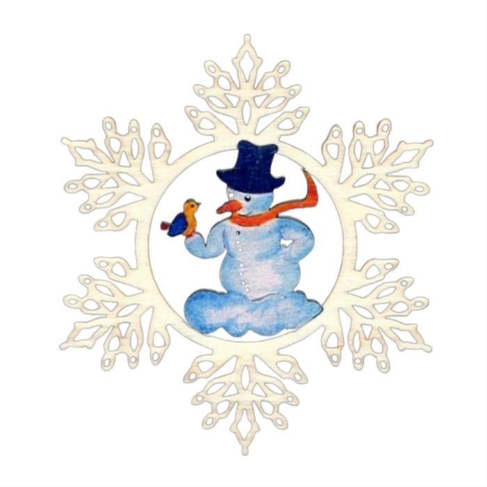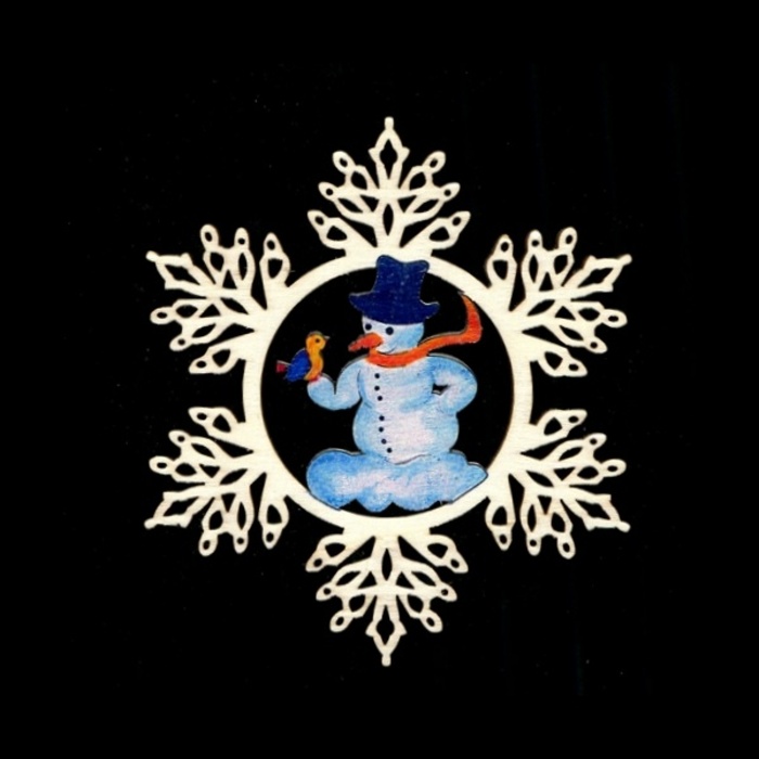 Ozdoba vločka se sněhulákem dřevěná 9cm
