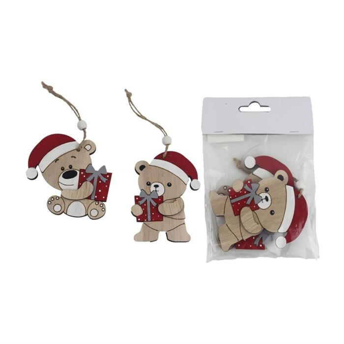Ozdoba dřevěný medvěd s čepicí a dárkem červeno-přírodní 2ks