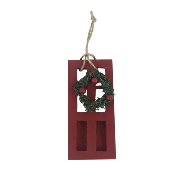 Originální a stylová dřevěná ozdoba ve tvaru domovních dveří ozdobených věncem. Tento jemný detail navodí pocit útulného domova a pohostinné vánoční atmosféry. Ideální pro zavěšení na stromeček, věnec nebo jako součást dárkového balení.