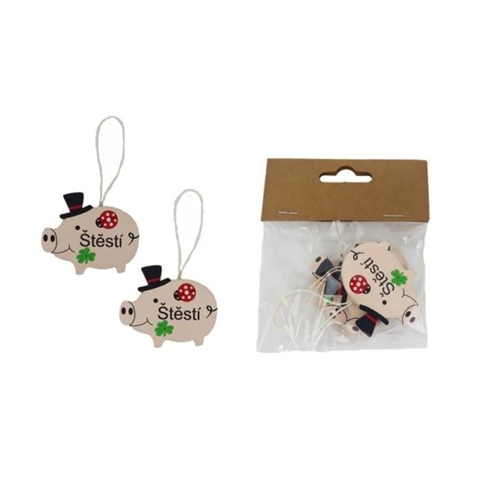 Ozdoba prase ŠTĚSTÍ s beruškou dřevěná 4ks
