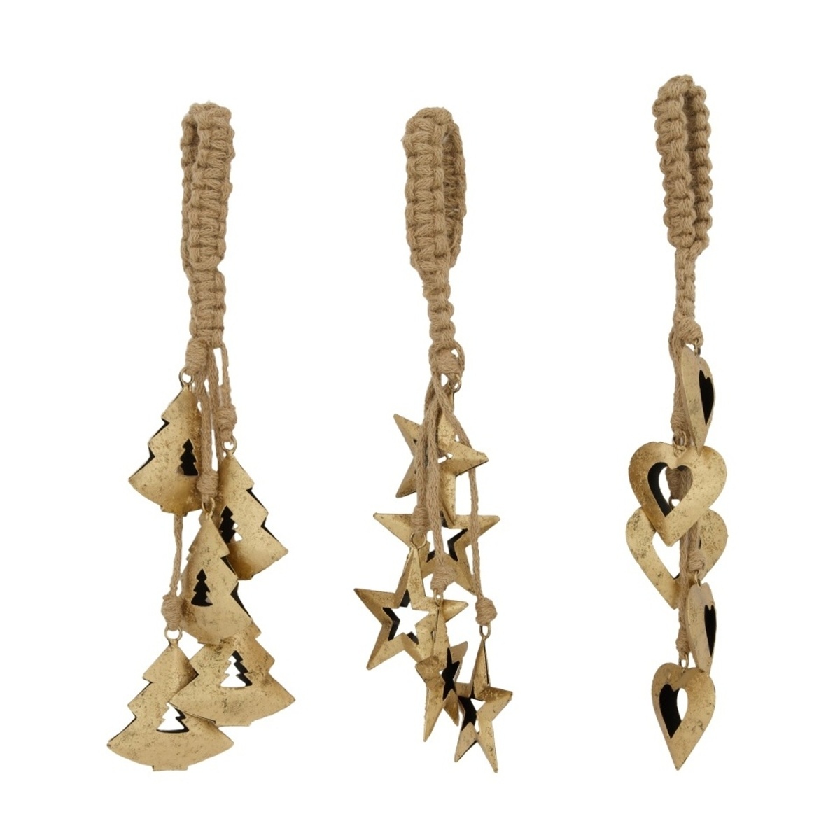 Stylové zlaté kovové závěsné ozdoby ve tvaru hvězdy, srdce a stromku. Ideální pro dekoraci vánočního stromku, věnců, girland, nebo jako elegantní doplněk do interiéru po celý rok. Kovový materiál dodává ozdobám odolnost a pevnost, zatímco zlatá barva přináší lesk a slavnostní atmosféru. Ozdoba v mixu provedení. Pokud si přejete konkrétní variantu, napište ji do poznámky, pokusíme se vyhovět. V případě nedostupnosti bude odeslán náhodný kus.
