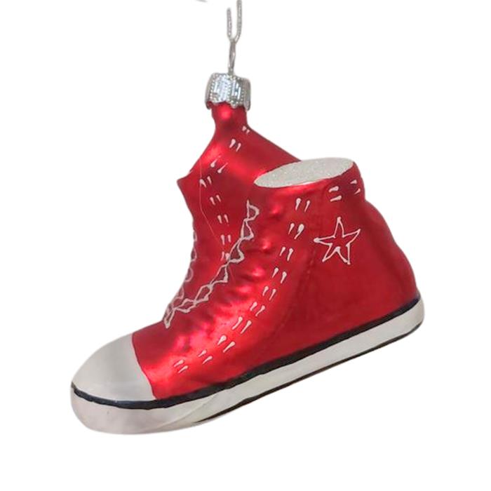 Stylová skleněná ozdoba ve tvaru tenisek zaujme svým originálním designem a zářivými barvami. Kombinace bílé a červené barvy dodává dekoraci hravý i moderní vzhled. Ideální pro milovníky netradičních vánočních ozdob.