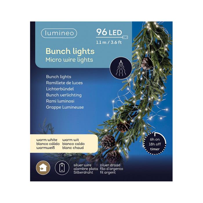 Stylové a výrazné osvětlení pro vaši sváteční nebo celoroční dekoraci. Tento svazek s 96 jemnými microLED diodami v teplé bílé barvě vytváří nádherný světelný efekt.