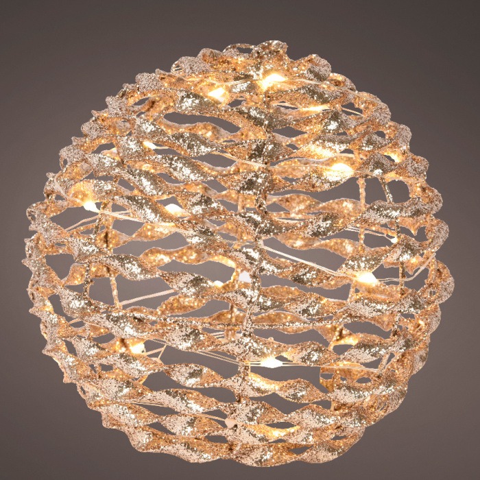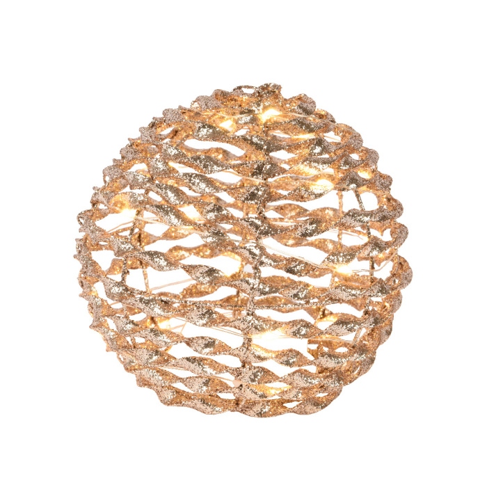 Zlatá vánoční koule z plastu zdobená glitry o průměru 15 cm je osvětlena 20 microLED světly v teplé bílé barvě. Napájená na baterie s praktickým časovačem, který usnadňuje používání a šetří energii. Skvělý doplněk pro váš vánoční stromek či jiné sváteční dekorace, který dodá příjemné a jemné osvětlení.