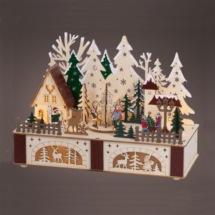 Kouzelná zimní dekorace ze dřeva, která spojuje světelný efekt s příjemnou hudbou. Tato detailně zpracovaná zimní krajina s domky a zvířaty je osvětlena 9 LED diodami v teplé bílé barvě a rozzáří váš domov. Jako bonus vytvoří příjemnou sváteční atmosféru.
