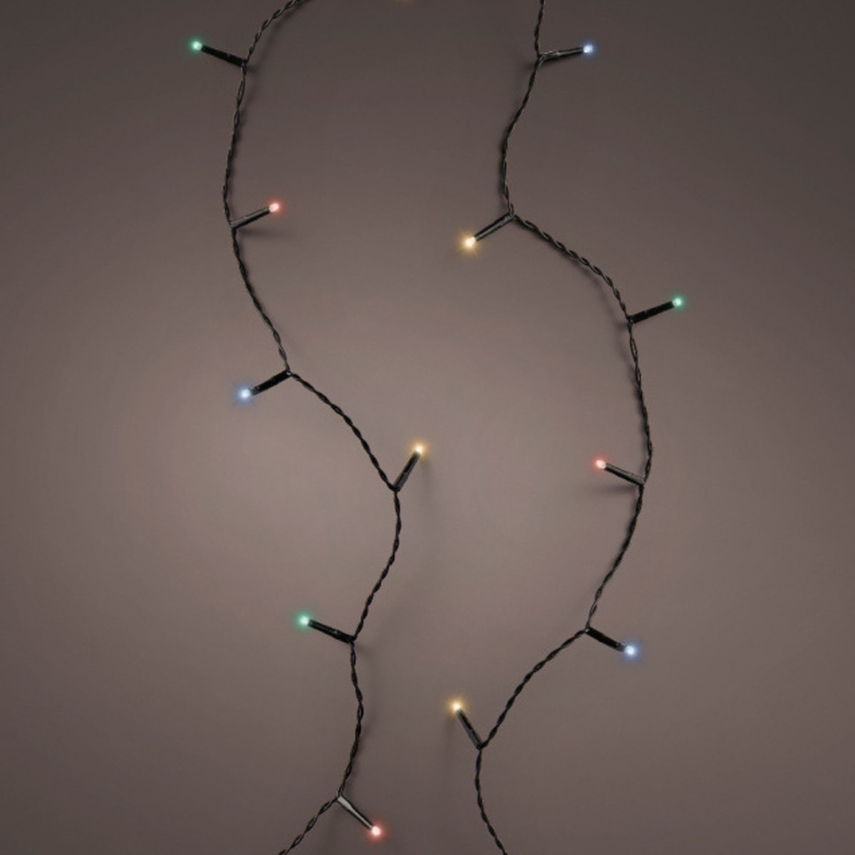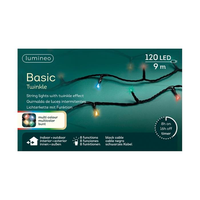 Vánoční světelný řetěz s 120 barevnými LED barevnými diodami navodí veselou a sváteční atmosféru doma i venku. Díky délce 9 metrů je vhodný na ozdobení vánočního stromku, pergoly, plotu či oken. Černý kabel působí decentně a nenápadně. Praktický časovač (8 h zapnuto / 16 h vypnuto) a 8 různých světelných funkcí včetně twinkle efektu umožní snadné nastavení podle nálady.