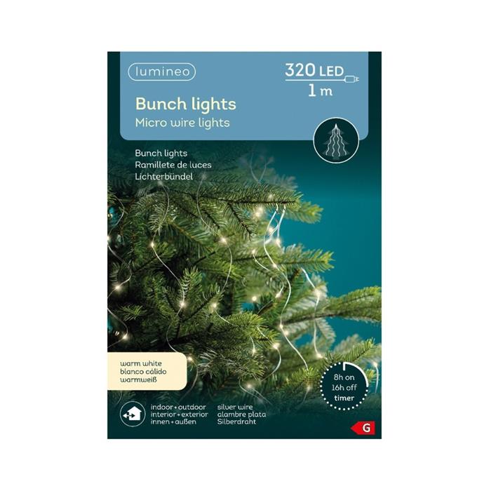 Ozdobte svůj domov jemným a elegantním světlem díky dekorativnímu svazku Bunch Lights. Na délce 1 m je umístěno 320 microLED diod v krásné teple bílé barvě, které vytvářejí kouzelný světelný efekt. Světýlka jsou na stříbrném drátku, který působí dekorativně a přizpůsobí se jakémukoli aranžmá. Vestavěný časovač (8h svícení / 16h vypnuto) vám ušetří starosti i energii.