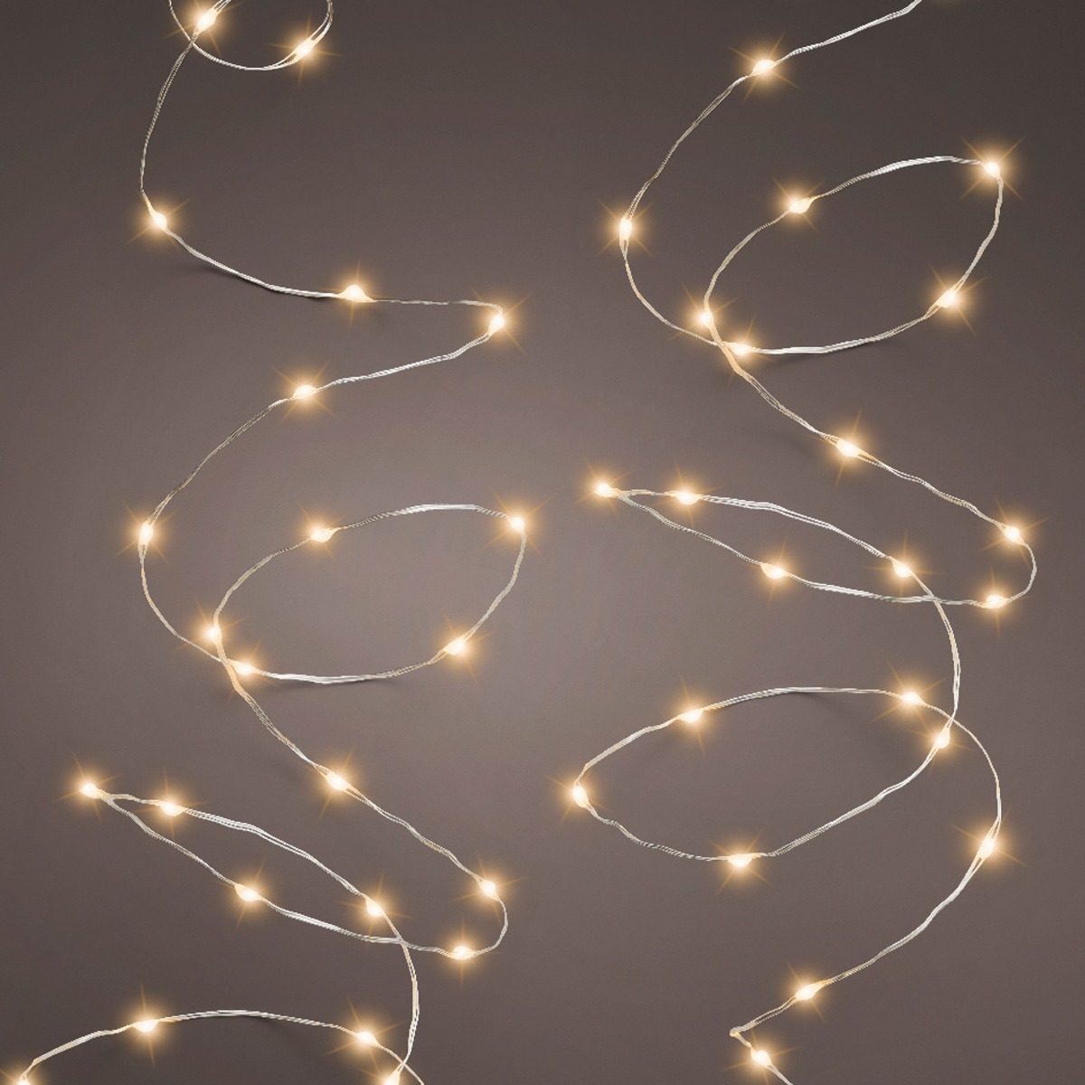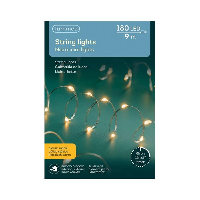 Elegantní světelný řetěz s 180 micro LED diodami v klasicky bílé barvě navodí kouzelnou atmosféru ve vašem domově i na zahradě. Díky jemnému stříbrnému drátku působí velmi decentně a snadno se tvaruje kolem stromků, větví nebo dekorací. Vestavěný časovač (8h svícení / 16h vypnuto) vám ušetří starosti i energii.