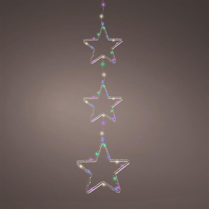 Rozjasněte svůj domov či zahradu kouzelnou dekorací tří svítících hvězd s barevným LED osvětlením. Dekorace je vysoká 58 cm a osazena 48 microLED diodami, které září v různých barvách a dodají prostoru veselou a sváteční atmosféru. Díky praktickému časovači a napájení na baterie je možné hvězdy snadno umístit kamkoliv bez nutnosti připojení k elektrické síti. Jsou vhodné pro interiér i exteriér, takže ozdobí nejen obývací pokoj, ale i zahradu či balkon.
