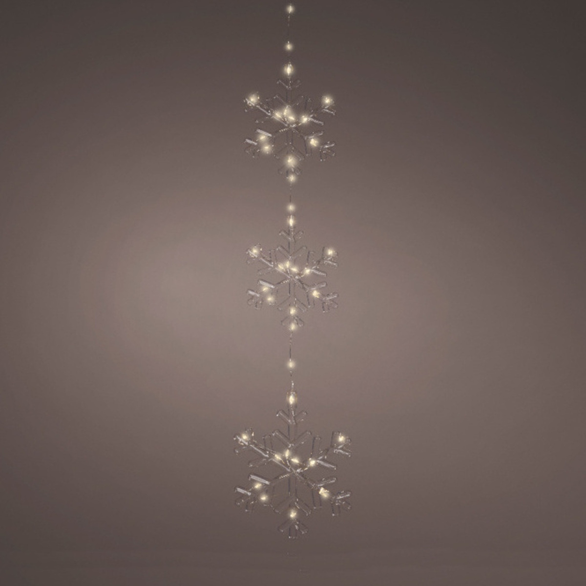 Kouzelná vánoční dekorace v podobě tří zavěšených vloček, které zkrášlí váš domov i zahradu. Díky 44 teple bílým microLED diodám vyniknou jejich jemné tvary a vytvoří nádhernou zimní atmosféru. Dekorace je napájena na baterie, takže ji můžete umístit téměř kamkoli – bez nutnosti připojení k elektrické síti. Praktický časovač zajistí, že se vločky budou samy pravidelně rozsvěcet, což šetří čas i energii.