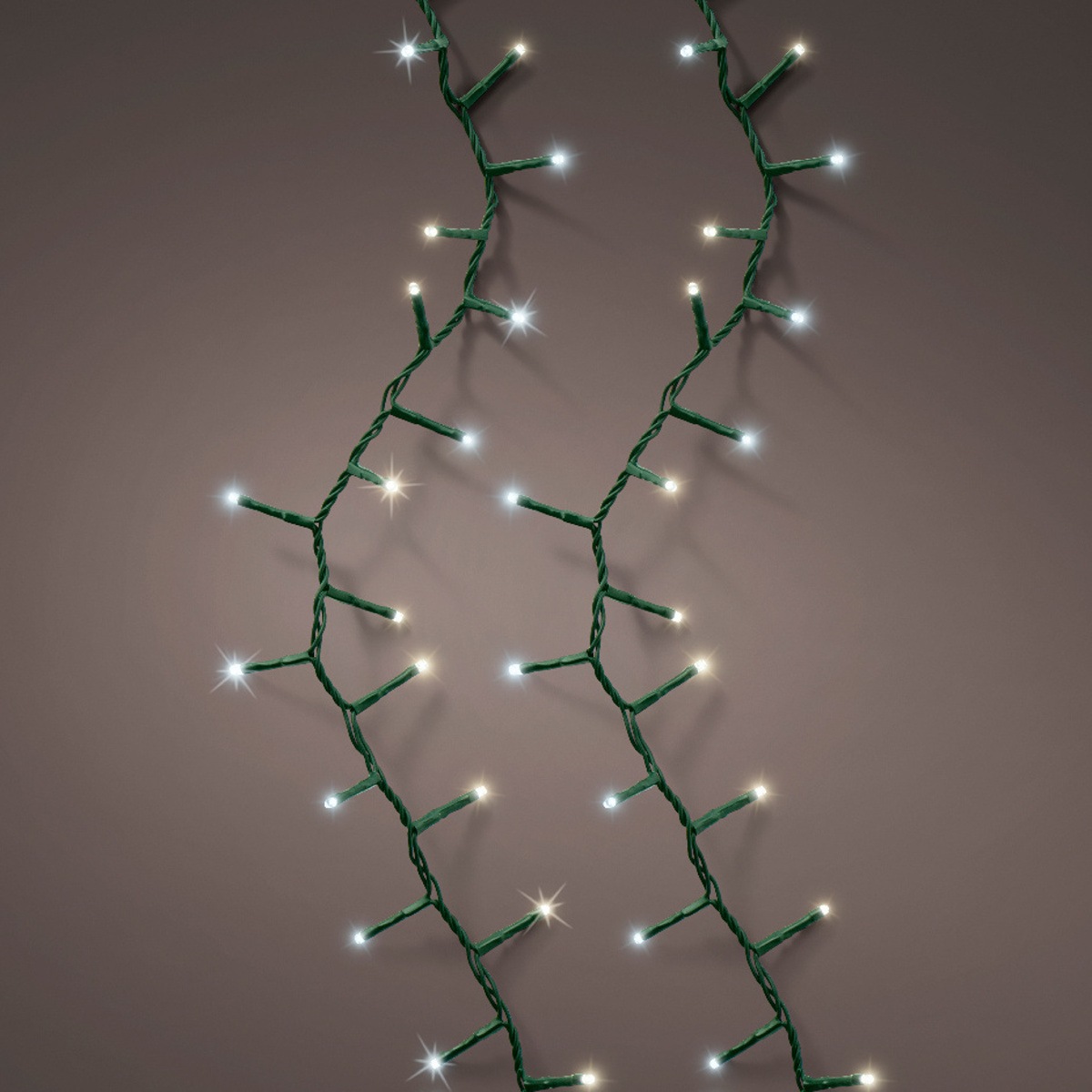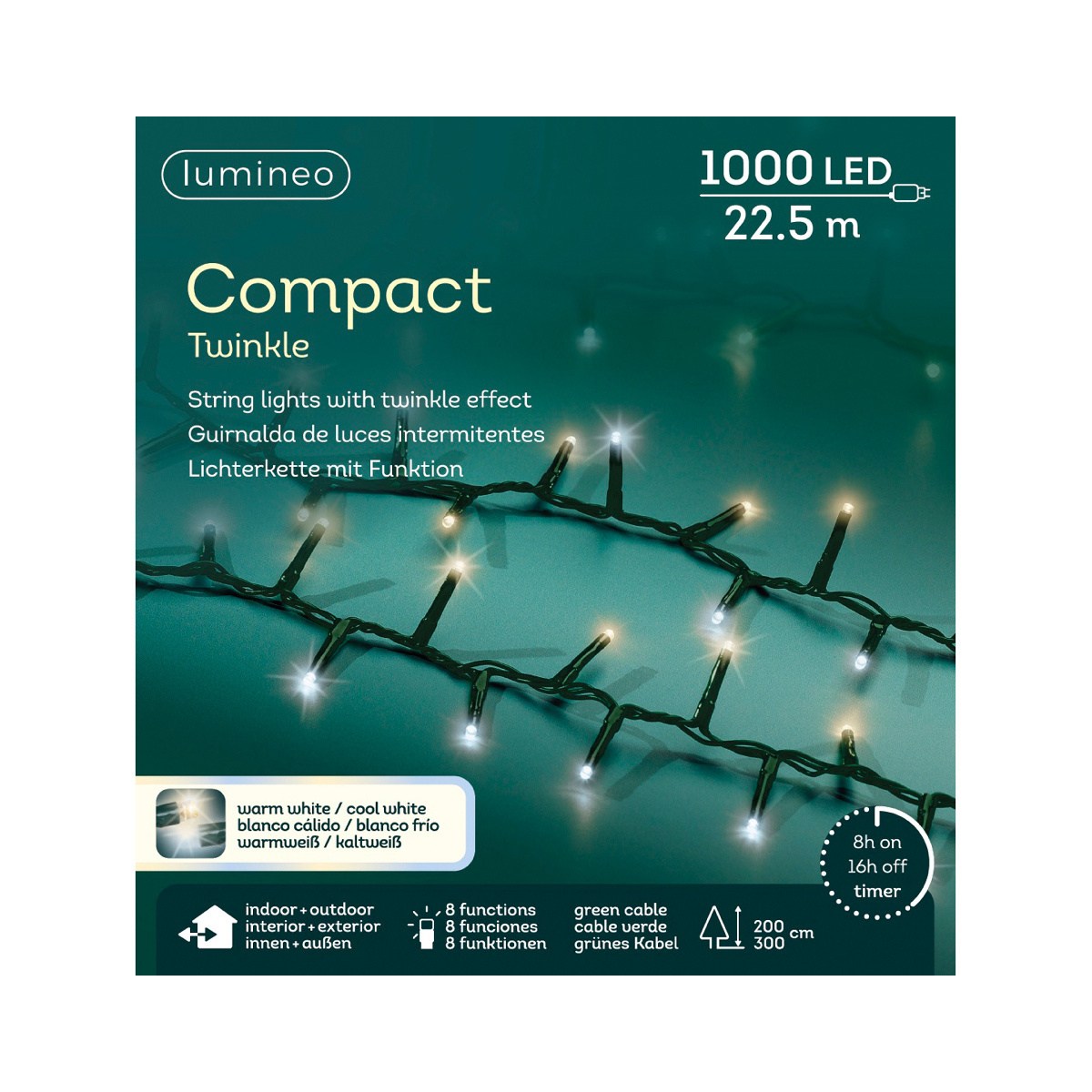 Rozzářete svůj domov, zahradu či vánoční stromek elegantním světelným řetězem Compact s 1000 LED diodami v kombinaci teplé a studené bílé barvy. Díky délce 22,5 metru krásně pokryje i větší plochy. Je vhodný pro venkovní i vnitřní dekorace. Praktický časovač (8h zapnuto / 16h vypnuto) se postará o bezstarostné používání i úsporu energie. Zelený kabel dokonale splyne s vánočním stromkem či zahradními keři.