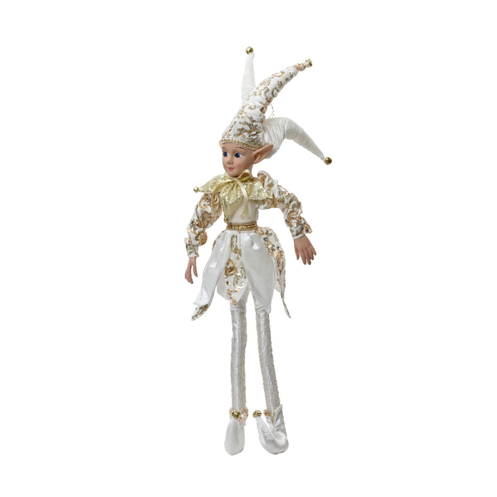 Vánoční interiérová dekorace. Elf šašek stojící polyesterový zlato-bílý 95cm.