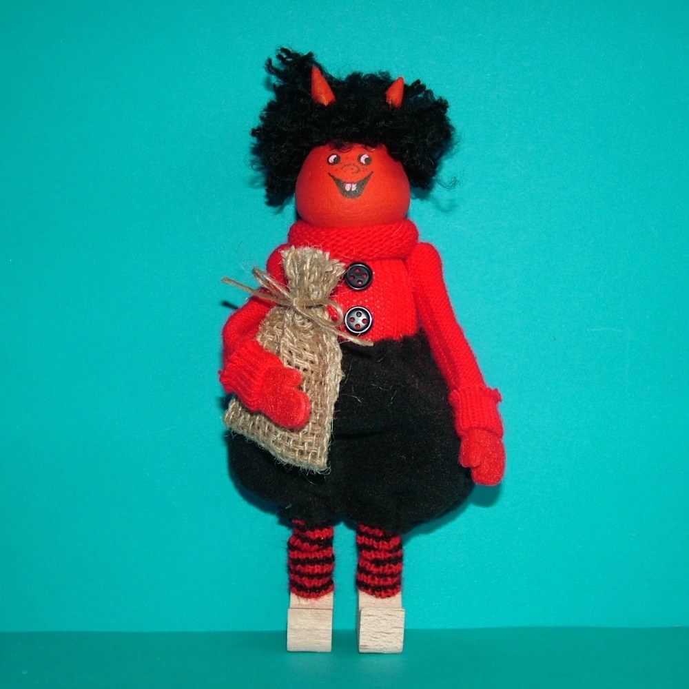 Přidejte do svého vánočního interiéru stylovou dekoraci v podobě stojícího čerta s pytlem. Tento černo-červený čert o výšce 25 cm je vyroben z kvalitních materiálů a skvěle se hodí na poličku, stůl nebo parapet.