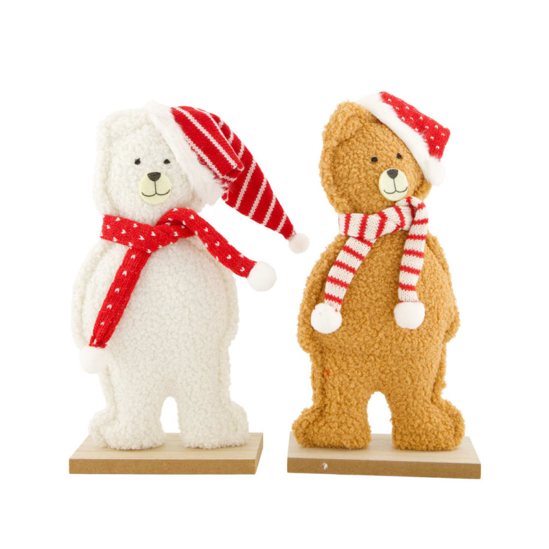 Medvěd stojící plyšový s čepicí a šálou na dřevěném podstavci bílý/hnědý mix 49cm