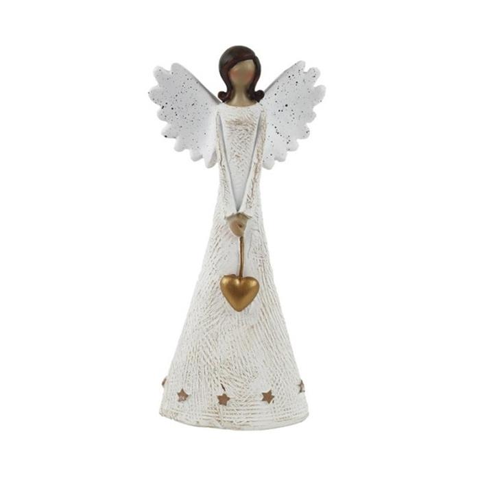Anděl stojící se srdcem a hvězdami polyresinový zlato-bílý 14cm