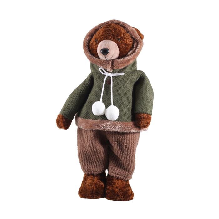 Stylový plyšový medvěd v zelené mikině s kapucí a hnědými kalhotami se stane výraznou ozdobou vašeho domova. Díky svému provedení je vhodný jako dekorace i originální dárek. Jeho zimní obleček s plyšovým lemem a bambulkami dodává hřejivý a sváteční nádech.