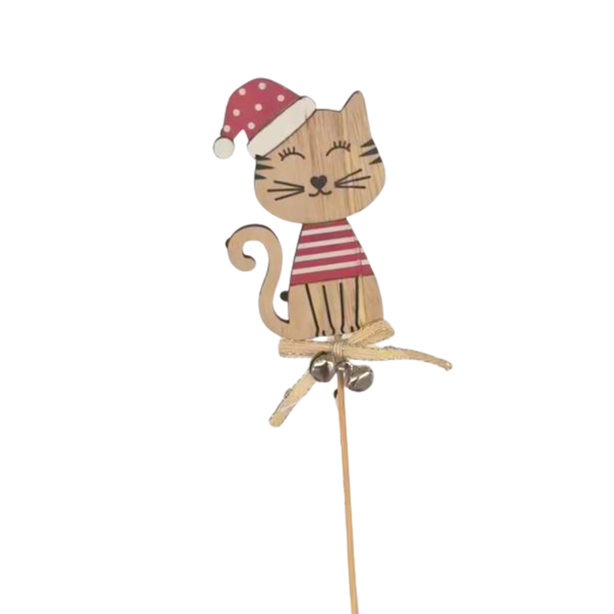 Roztomilá kočka s rolničkami a čepicí se snadno zapíchne do květináče, aranžovací hmoty nebo adventního věnce. Je ideální pro vánoční dekorace, stolní aranžmá nebo kreativní projekty.