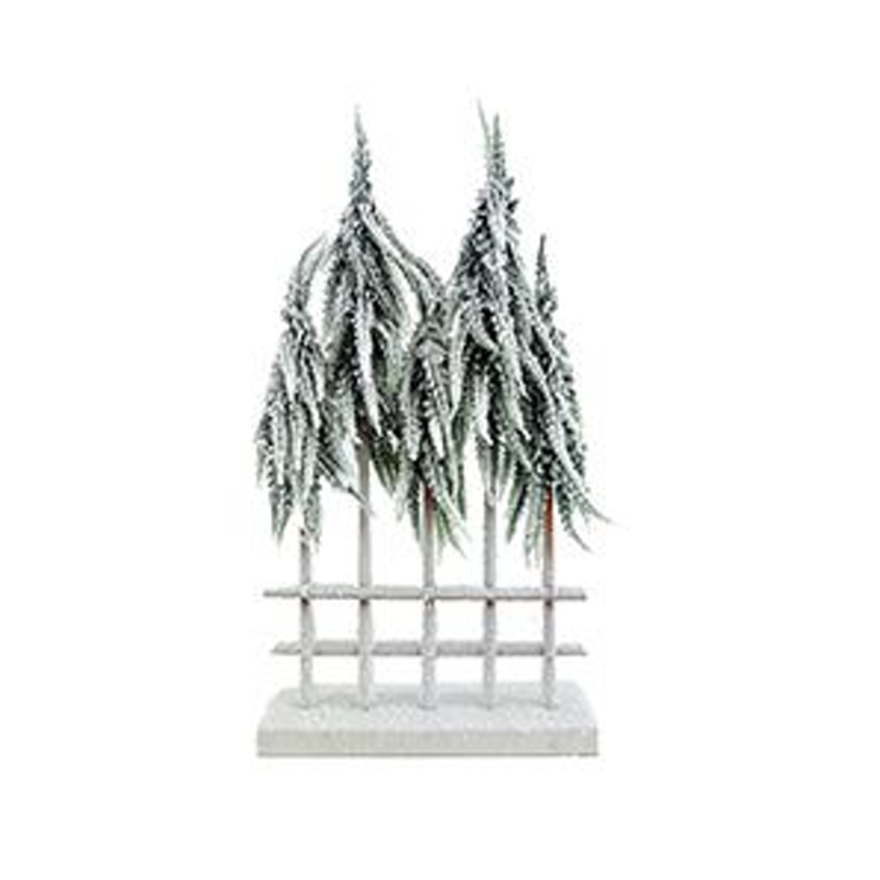 Tato detailně zpracovaná zimní dekorace znázorňuje zasněžené stromy a plot na pevném podstavci. S rozměry 48 × 25 cm je ideální jako výrazný středový prvek na stůl, komodu, okenní parapet nebo do výlohy.