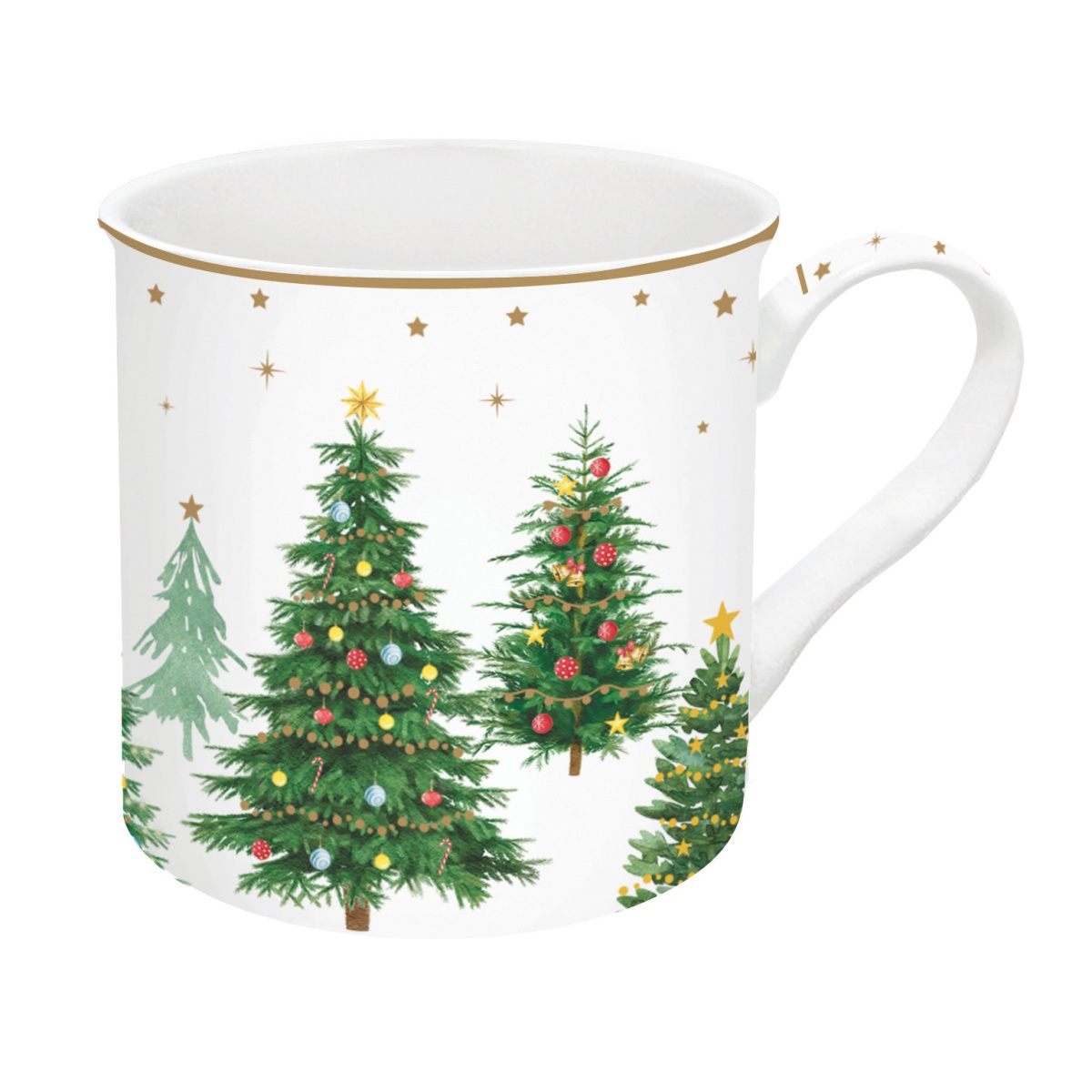 Vánočně laděný hrnek FESTIVE TREES z kvalitního bílého porcelánu je ideální pro servírování horké čokolády, kávy nebo čaje během zimních a svátečních dní. Stylový dekor s motivem vánočních stromků dodává stolování slavnostní a útulnou atmosféru.