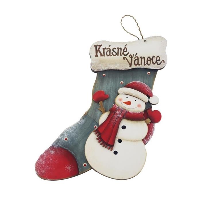 Popis produktu Cedule dřevěná ponožka KRÁSNÉ VÁNOCE se sněhulákem 31cm