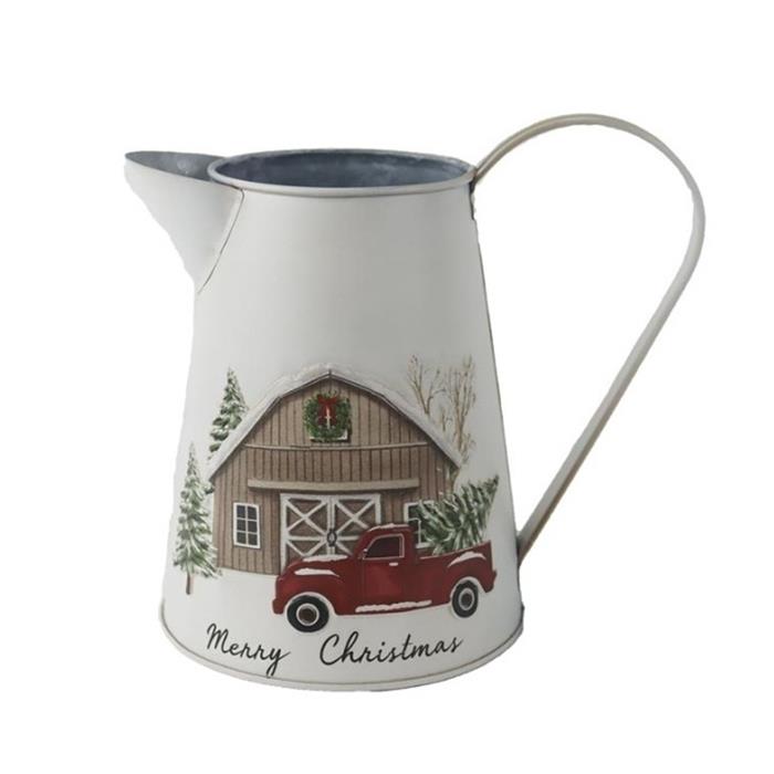 Džbán/konev kovový MERRY CHRISTMAS s autem a stodolou a 1 uchem bílý 18cm