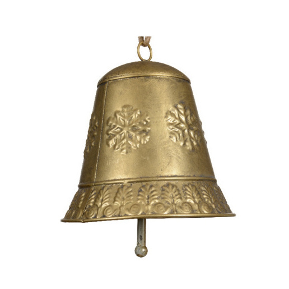Elegantní závěsný kovový zvonek ve zlaté barvě je zdoben reliéfem vloček a jemným dekorem po obvodu. Je ideální jako vánoční dekorace do interiéru, kde navodí sváteční atmosféru. Díky závěsnému oku jej snadno umístíte na dveře, okna či stěnu.