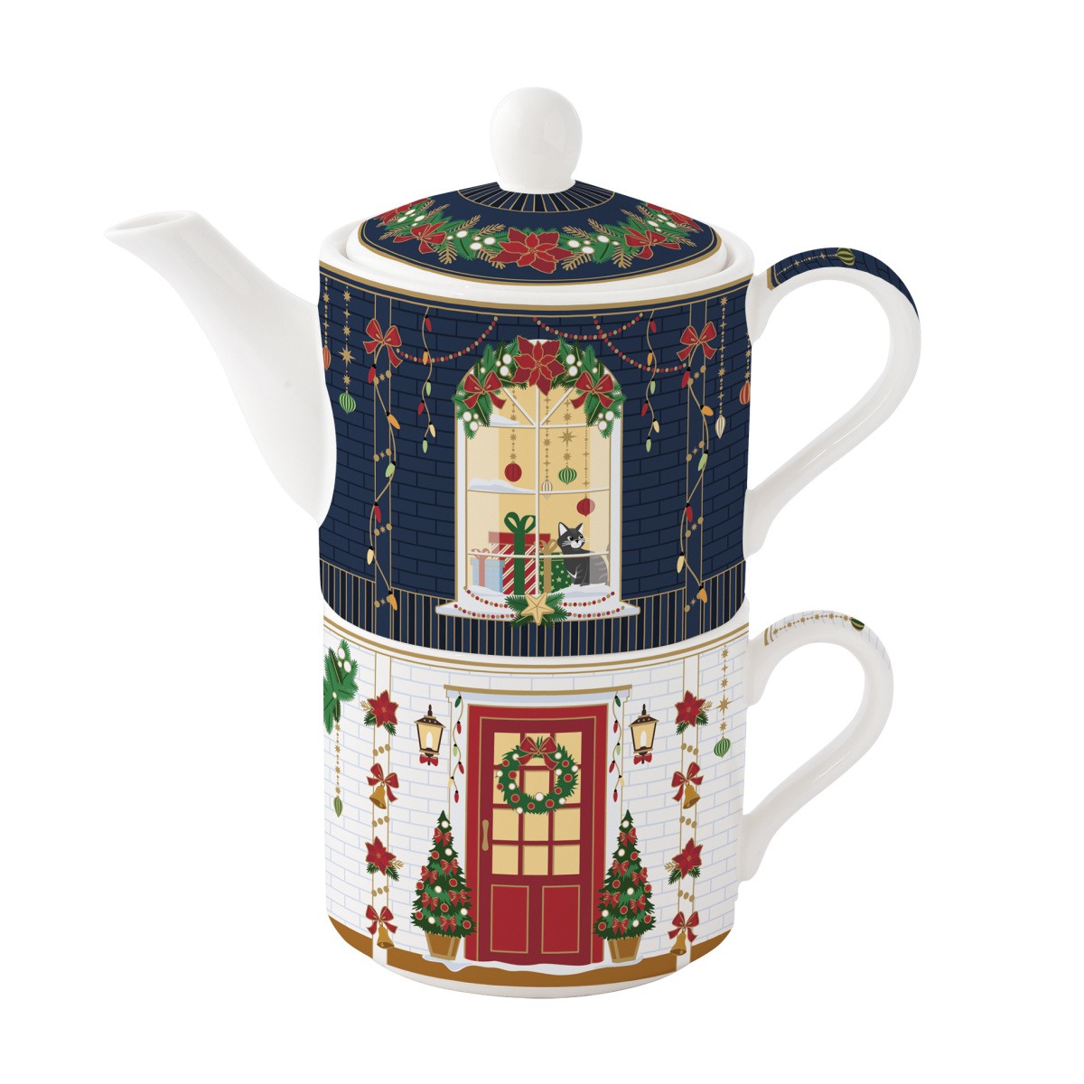 Elegantní čajová sada FESTIVE AVENUE kombinuje konvičku a šálek v jednom, která je ideální pro chvíle klidu a pohody během zimních svátků. Vyrobena z kvalitního porcelánu, s jemným vánočním dekorem, vnese do vašeho stolování slavnostní atmosféru a styl. Perfektní pro podávání čaje, bylinkových nálevů či horké čokolády.