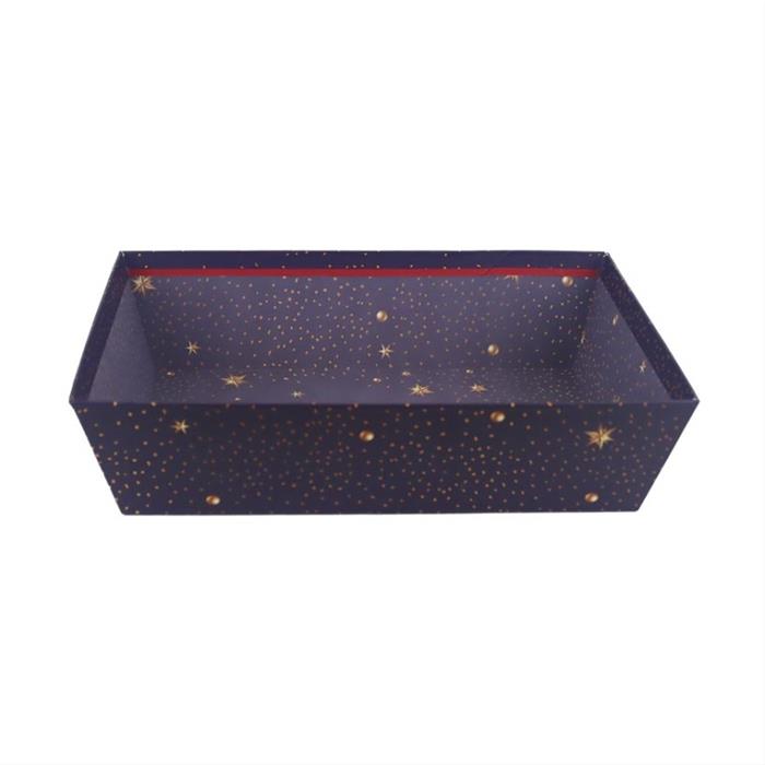 Elegantní dárková krabice bez víka o velikosti 33 cm zaujme hlubokou tmavě modrou barvou s vánočním motivem hvězd. Je ideální pro stylové a přehledné balení dárků, které chcete nechat částečně viditelné – třeba pro naaranžované sety, textil nebo drobnosti.