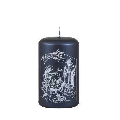 Válcová svíčka UNIPAR GLORIA s motivem Svaté rodiny v metalické modré, výška 10 cm – duchovní a elegantní vánoční dekorace..