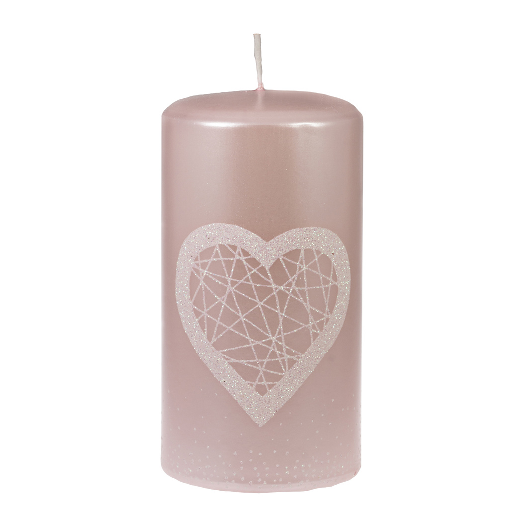 Jemná růžová svíčka válec UNIPAR SOFTNESS s motivem srdce, výška 15 cm – ideální pro něžnou a romantickou vánoční dekoraci.