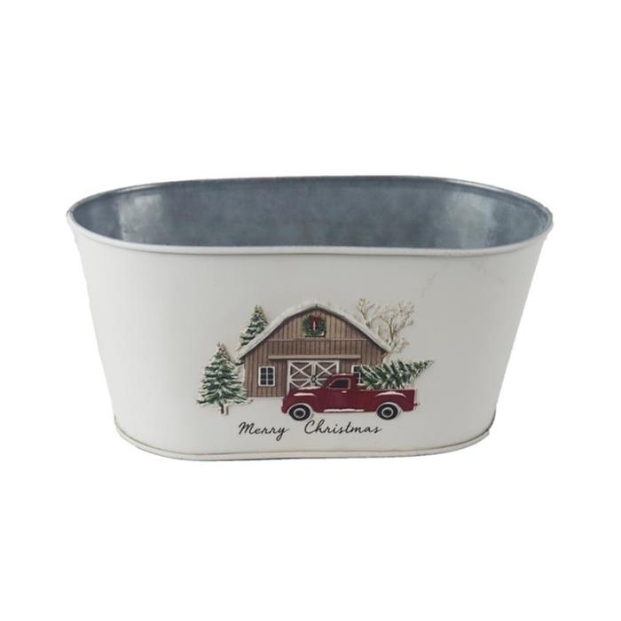 Obal oválný plechový MERRY CHRISTMAS s autem a stodolou bílý 19cm
