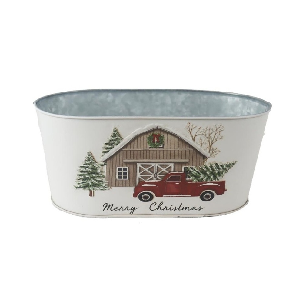 Přidejte svým vánočním dárkům styl a originalitu s tímto oválným plechovým obalem zdobeným motivem veselého auta a nápisem „MERRY CHRISTMAS“. Ideální jako krásná dekorace do vašeho domova.