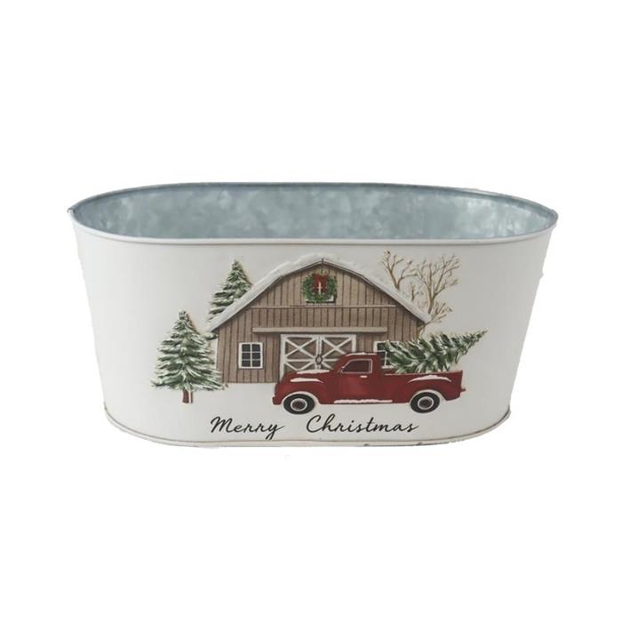 Obal oválný MERRY CHRISTMAS s autem a stodolou bílý 22,5cm
