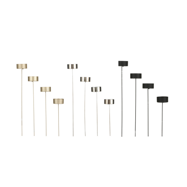 Sada čtyř kovových držáků na čajové svíčky s zápichem, každý s postupně menší velikostí. Držáky jsou dostupné v jedné z barevných variant – stříbrné, zlaté nebo černé. Praktické a stylové doplnění vaší dekorace, vhodné pro interiéry i zahrady.