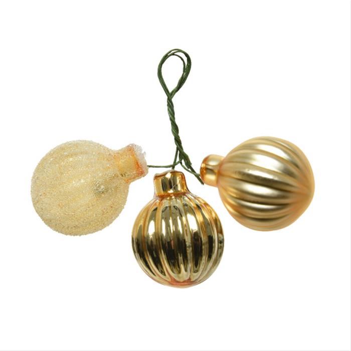 Elegantní sada tří svazkových skleněných koulí v různých povrchových úpravách. Díky praktickému drátku se snadno upevní do věnců, aranžmá nebo na vánoční stromeček. Zlatá barva dodá každé dekoraci slavnostní a luxusní vzhled.