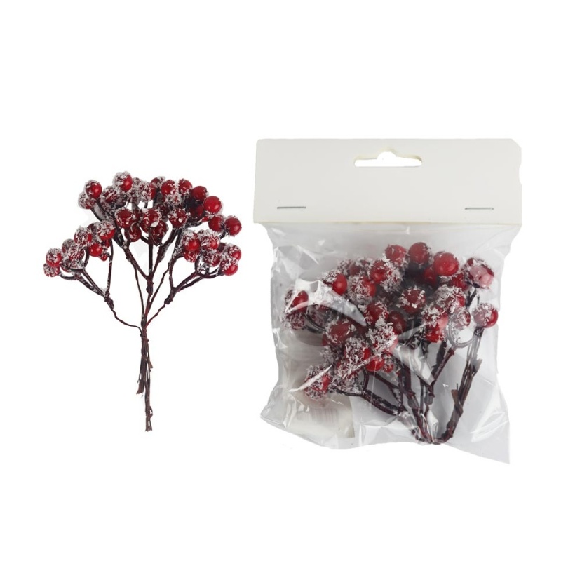 Přízdoba větvička umělých ojíněných bobulí ve svazku červená 12cm