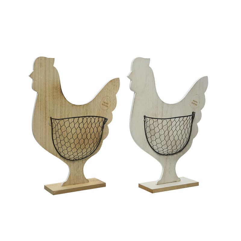 Dekorativní slepice na podstavci s kapsou je vyrobena ze dřeva s praktickou kapsou z pletiva, ideální pro velikonoční aranžmá nebo jako stylová dekorace na stůl. Pečlivé zpracování a přírodní materiály dodávají dekoraci autentický vzhled a rustikální šarm.