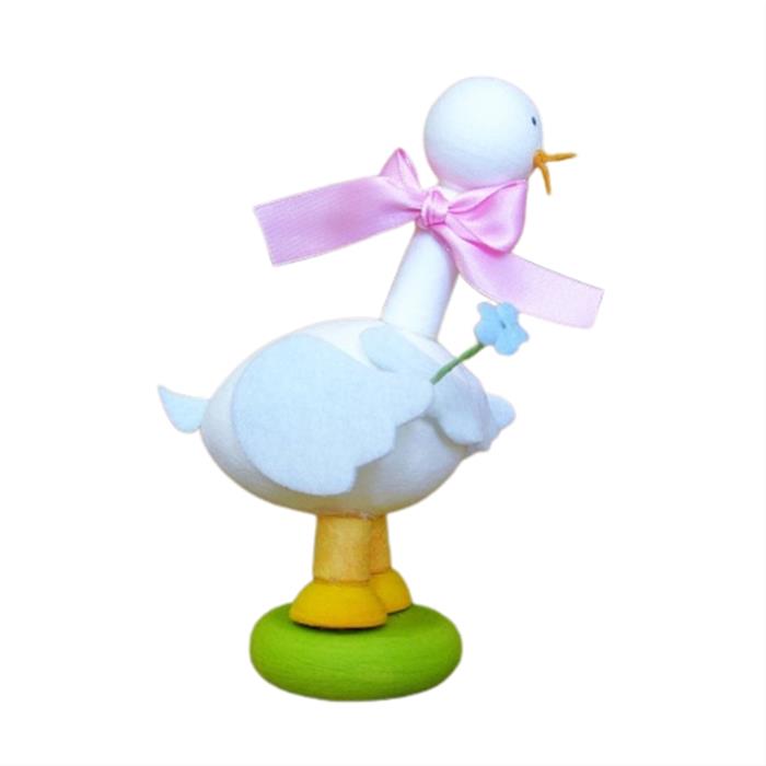 Velikonoční dekorativní husa o velikosti 11 cm je vyrobena z kombinace vaty, plsti, plyše a látky a doplněna stuhou a květinou. Bílé provedení působí jemně a univerzálně, takže se hodí do jarních aranžmá, na stoly, poličky či do košíků s velikonoční tématikou. Roztomilý design dekorace přinese do vašeho domova veselou a hravou atmosféru jara, aniž by vyžadoval jakoukoliv údržbu.