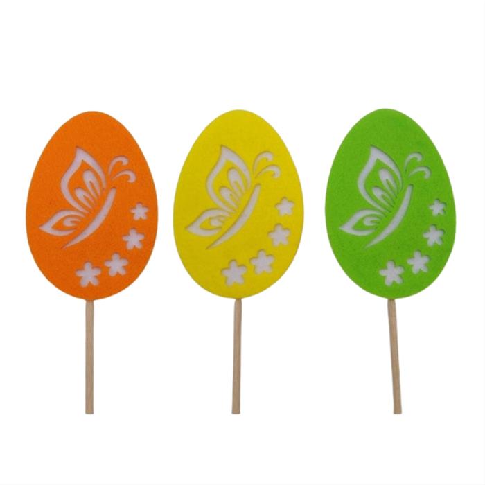 Vajícˇko je zdobené malým motýlkem, který dodává dekoraci hravý a jemný vzhled. Produkt je dodáván v mixu barev a motivů, takže si můžete vytvořit pestré a originální aranžmá.